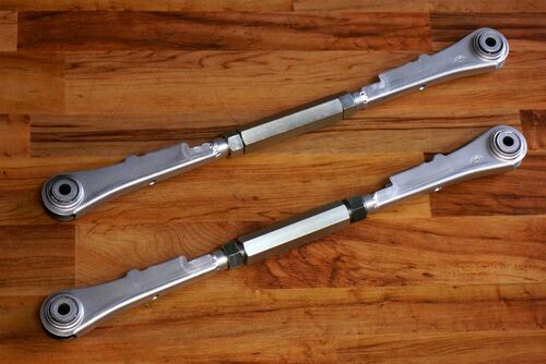 アーム両端がピロになっている、ワンオフのコントロールアームを装着してみました。 自由なアライメント調整ができるのはもちろんですが、見た目が非常にエロティック!!